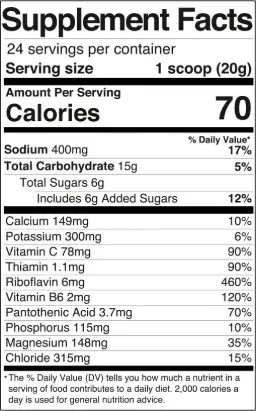 Maltodextrin, fructose, dextrose, tribasic sodium citrate, tribasic potassium citrate acidifier: citric acid, dibasic calcium phosphate, sodium, chloride, tribasic magnesium citrate, magnesium carbonate, flavor, vitamin C (L-ascorbic acid, stabilizer: ethylcellulose), sweetener: sucralose, nicotinamide, vitamin B2 (riboflavin), coloring: cochineal, calcium D-pantothenate, vitamin B1 (thiamine hydrochloride), vitamin B6 (pyridoxine hydrochloride).