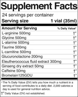 Water, dextrose, fructose, L-Arginine, glycine, L-Alanine, taurine, L-Carnitine, acidity regulator: citric acid, glucuronolactone, Eleutherococcus (Eleutherococcus senticosus Maxim.) root, e. s. titrated to 5 percent saponins, flavor, Ginseng (Panax ginseng C.A. Meyer) root, e.s. titrated to 30 percent ginsenosides, caffeine, bromelain from pineapple stem, preservatives: potassium sorbate, sodium benzoate.